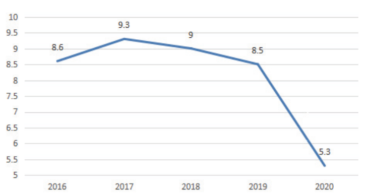 图1:2016-2020年城镇居民人均可支配收入增幅