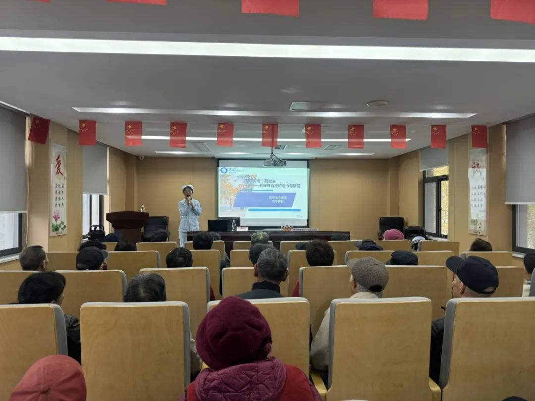 本次活动特邀南京市中医院老年科副主任护师、护士长陈莉围绕“健康养老,我做主”主题,讲授了老年综合征的具体表现和干预、老年综合评估等内容。讲座内容详细、实用,讲解通俗易懂,丰富了社区居民的健康养生知识。